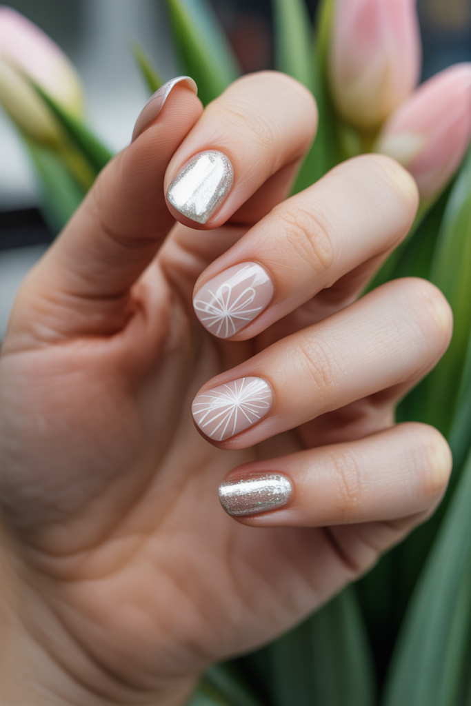 It suits those who want a simple yet elegant look for spring. The silver detail gives the nails a fresh, polished feel.