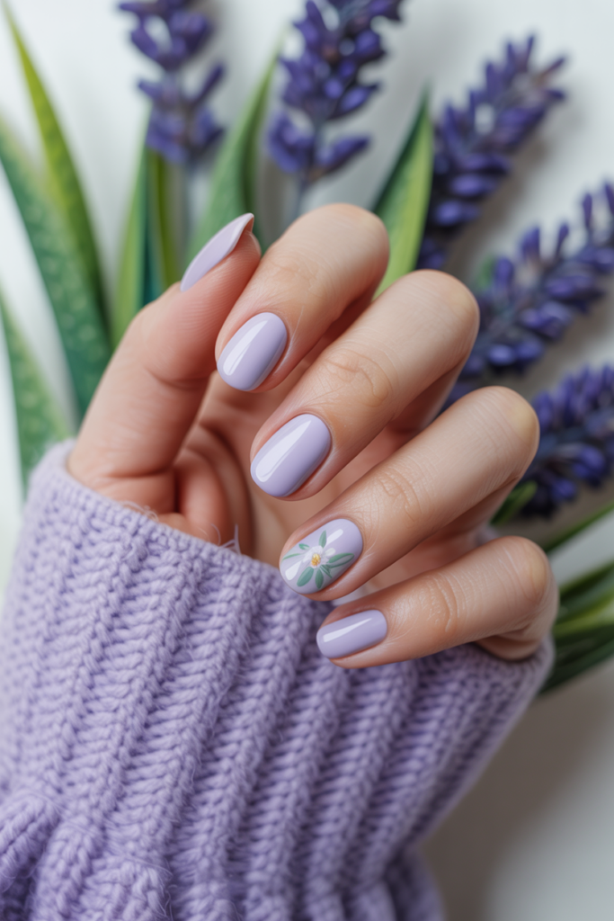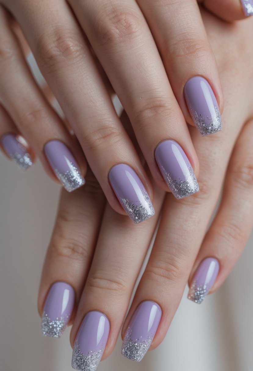 This nail design blends soft lilac polish with silver glitter accents. The shimmer adds subtle sparkle without being too bright.