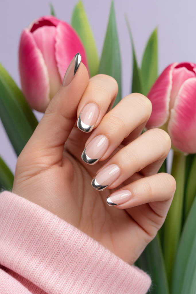 Chrome accent tips add a modern touch to classic manicures. They highlight just the edges of the nails with a shiny, reflective finish. This style pairs well with soft pastels or neutral colors for a subtle yet stylish look. Chrome accents bring a fresh, trendy feel without being too bold.