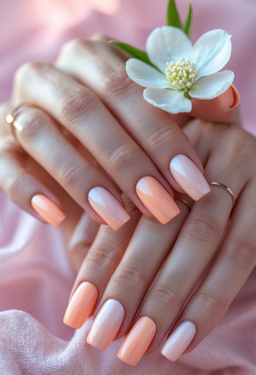 Peach ombre nails blend light and dark shades smoothly. The gloss topcoat adds a shiny, polished finish. This look is simple yet modern, fitting for spring. It works well for both casual and formal settings.