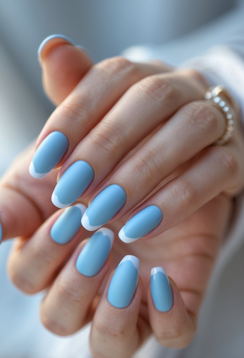 This look pairs soft matte sky blue nails with shiny, glossy tips. It creates a clear contrast that feels modern and clean. The style works well for any occasion, offering a simple yet polished finish. It suits many skin tones and adds subtle interest without being loud.