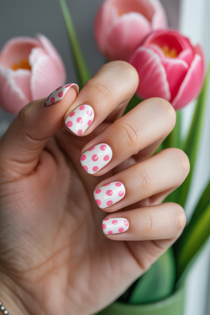 White and pink polka dots create a fresh, simple look perfect for spring. This design blends soft colors with playful dots, offering a balance between fun and elegance.