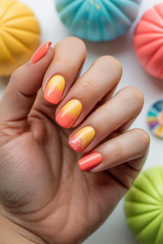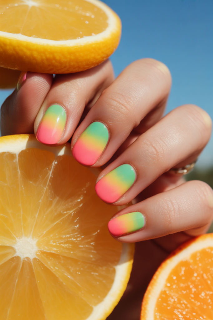 Juicy ombre gradients blend bright, fresh colors smoothly on the nails. They often use shades like pink, orange, and yellow, creating a look that feels lively and perfect for summer.