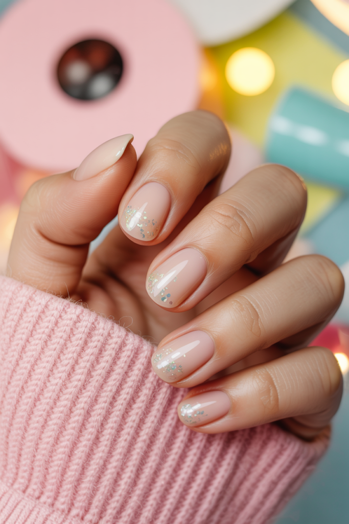 Glossy nude nails with glitter offer a simple yet polished look. The shine keeps nails bright, while glitter adds a subtle sparkle. This style fits well for both casual and formal occasions, making it a versatile choice for summer.