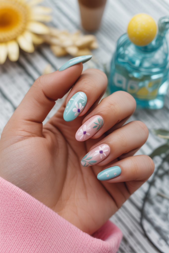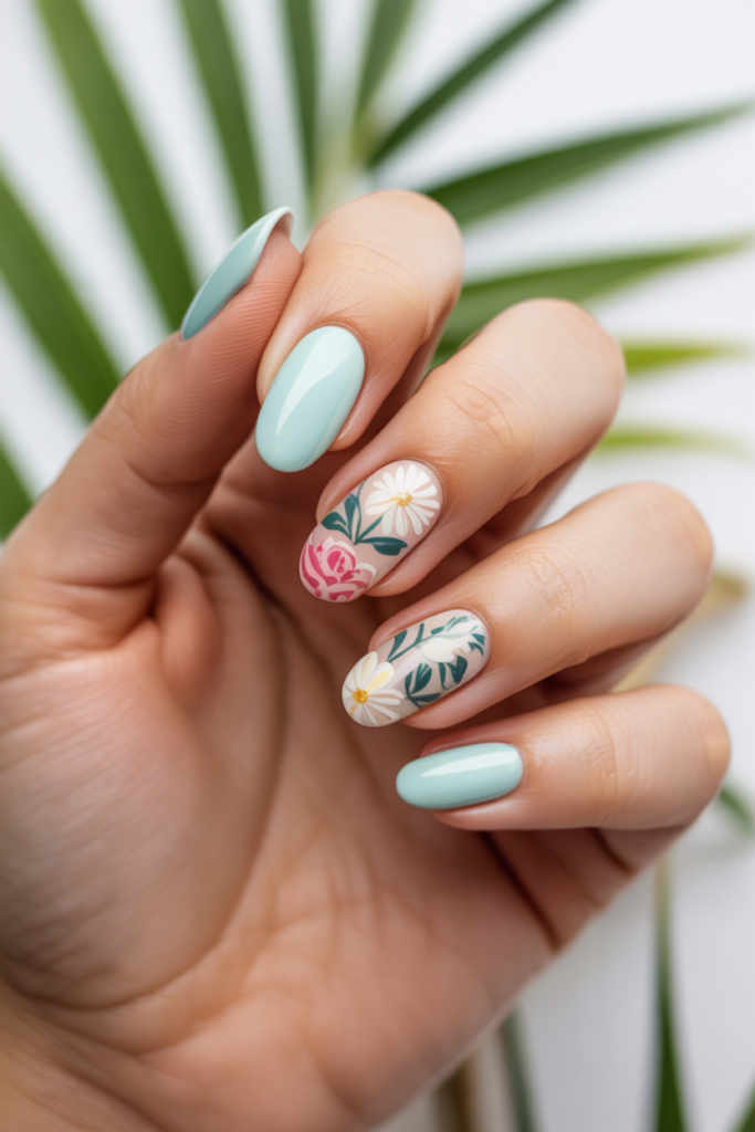 Almond-shaped nails offer a smooth, elegant base for floral designs. These flowers can be small and delicate or bold and colorful, fitting both casual and formal looks. They add a fresh, summery touch without overpowering the natural nail shape.