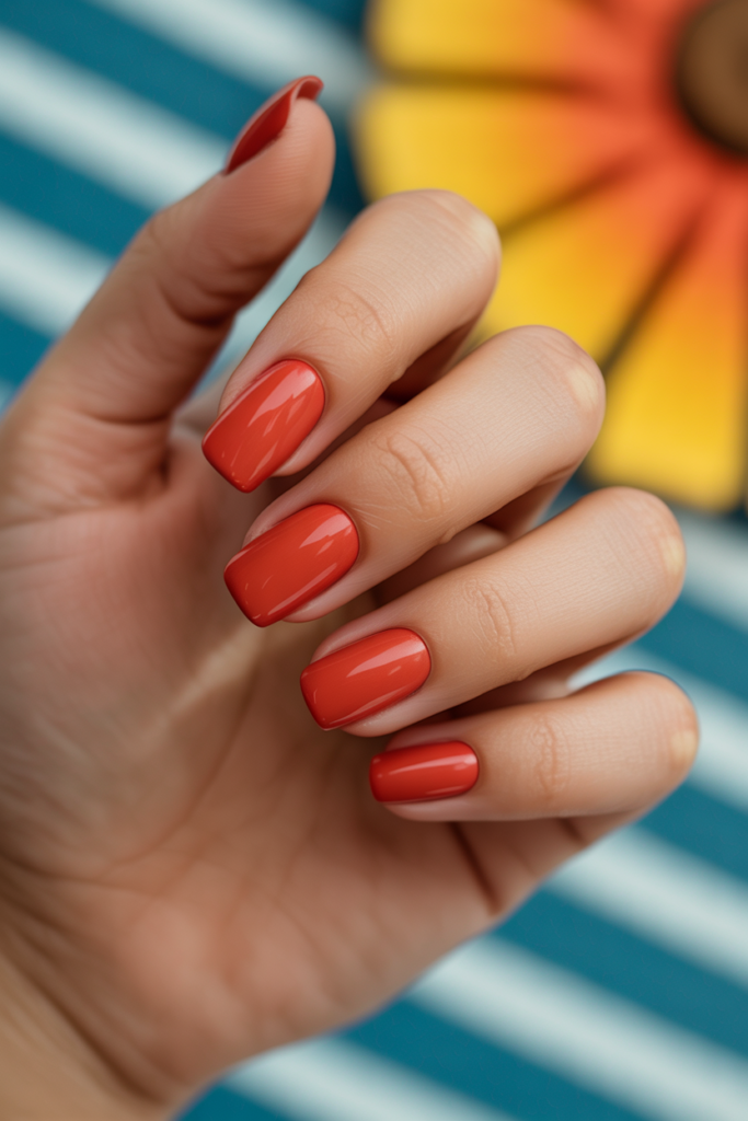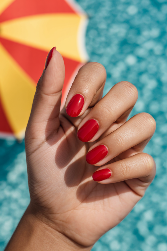 Bright summer cherry red nails offer a bold and classic look. This color works well for many occasions, from casual outings to special events. The glossy finish adds a polished touch and catches the light beautifully. It remains a popular choice every summer.