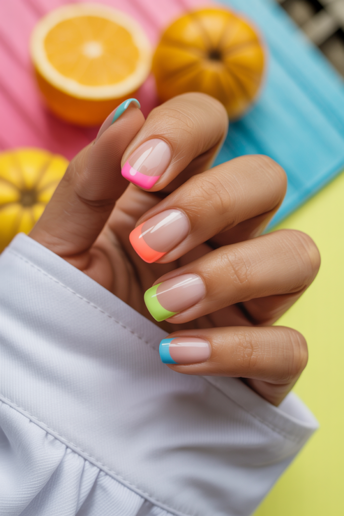 French tips get a fresh update for summer. Bright colors like neon pink or pastel shades replace the classic white.