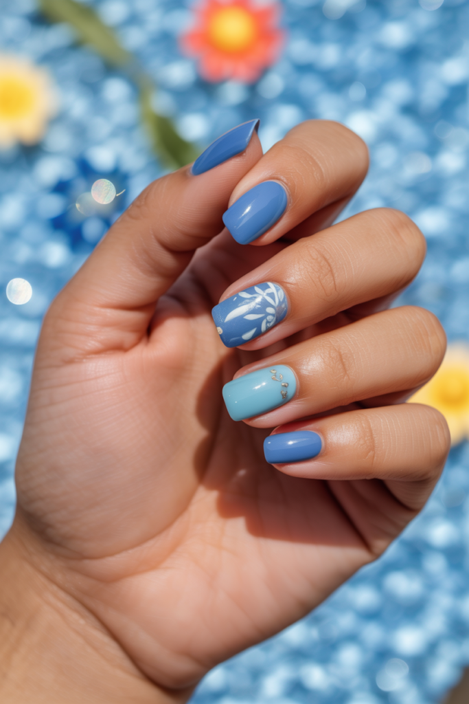 Gel nails in blue shades offer a fresh and cool look for summer. They range from soft pastels to bold navy, fitting different styles and moods. The gel polish gives a smooth, shiny finish that lasts longer than regular polish. This makes them ideal for a low-maintenance, stylish summer manicure.