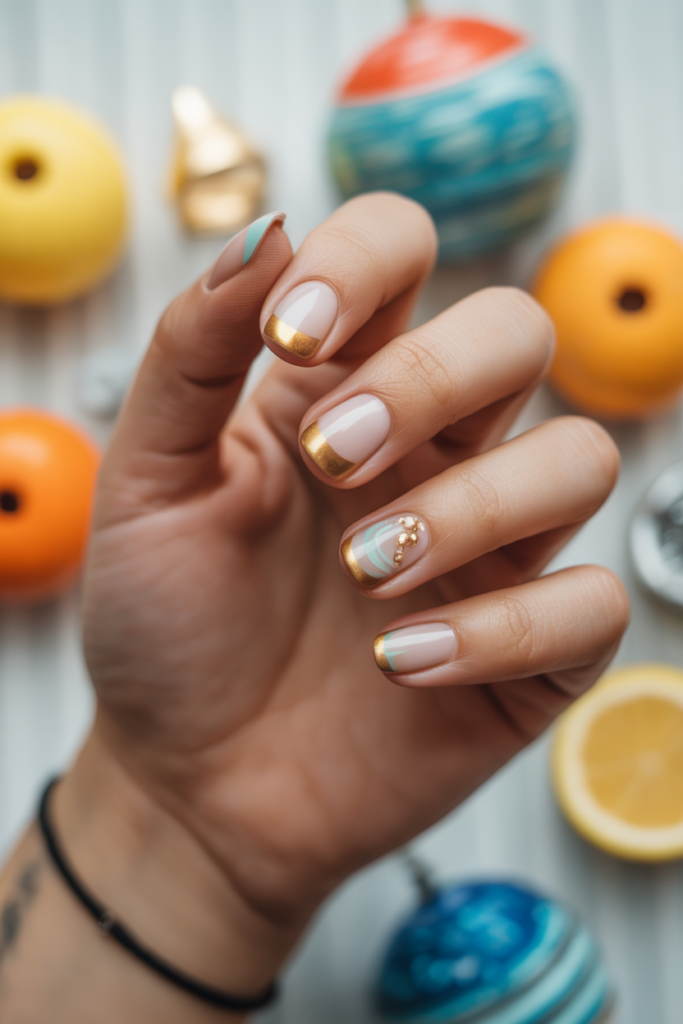Short nails with gold accents offer a simple yet elegant look. The gold details can be subtle, like thin lines or dots, adding shine without overwhelming the nail.