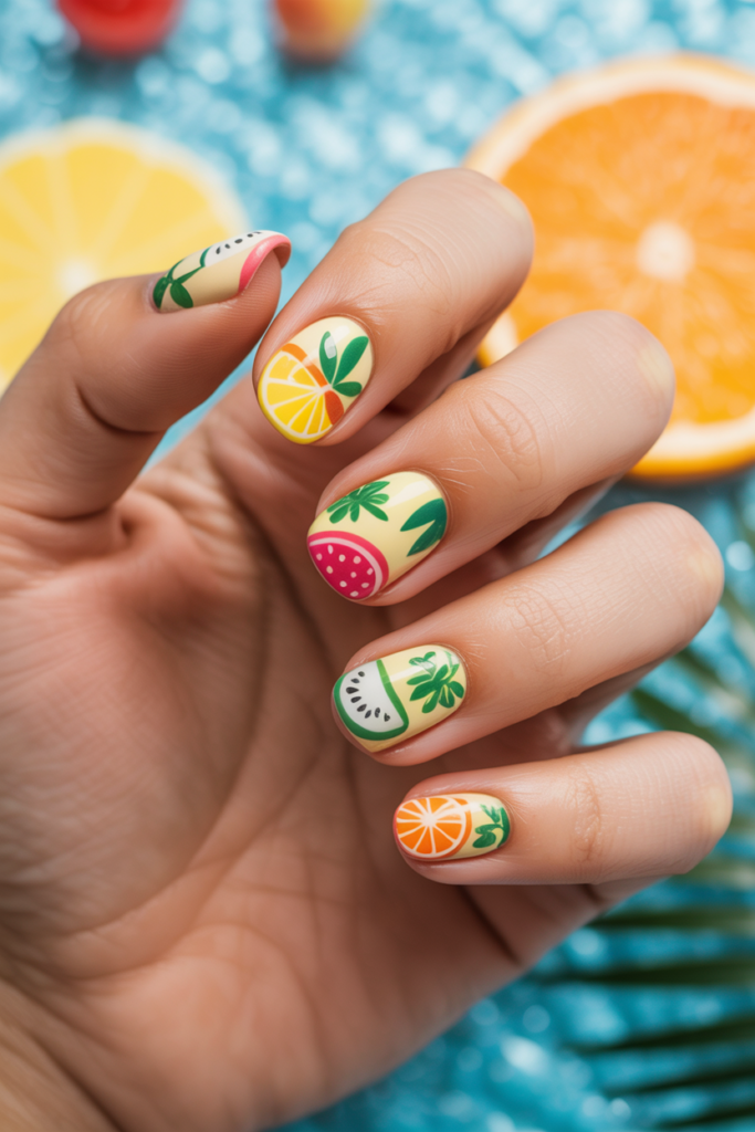 Tropical fruit nail art is a popular choice for summer. Designs often include bright colors like yellow, orange, and green to mimic fruit such as mango, watermelon, and citrus.