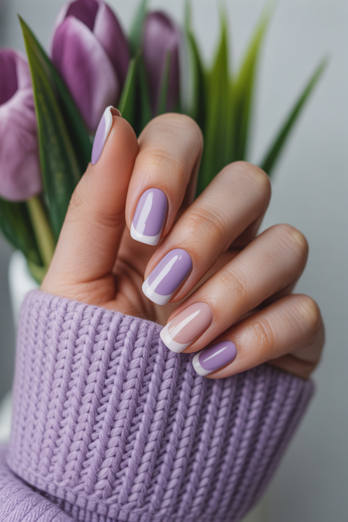 The purple can be dark or pastel, fitting both casual and formal settings. It works well with natural or gel nails for spring.