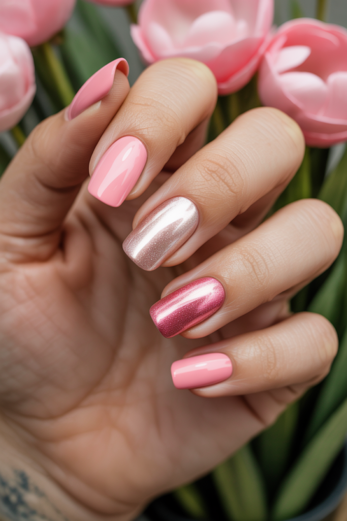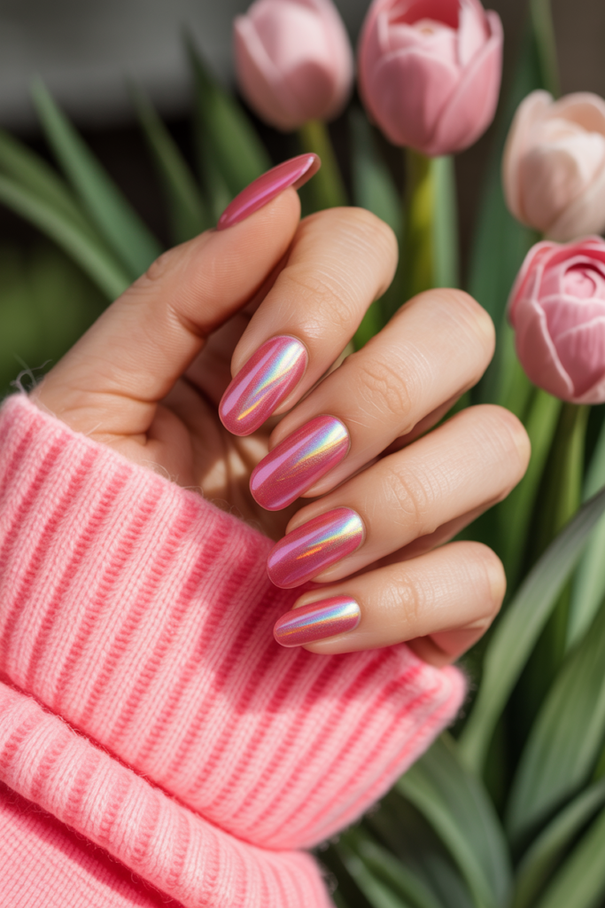 This look uses bright electric pink polish paired with a holographic shine. The shine adds a reflective, rainbow-like effect that catches the light. It creates a modern, eye-catching style perfect for spring. The design works well on all nail shapes and lengths.