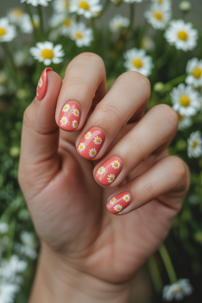This look pairs a shiny coral gel base with small white daisy accents. The flowers add a delicate, fresh touch without overwhelming the nails.
