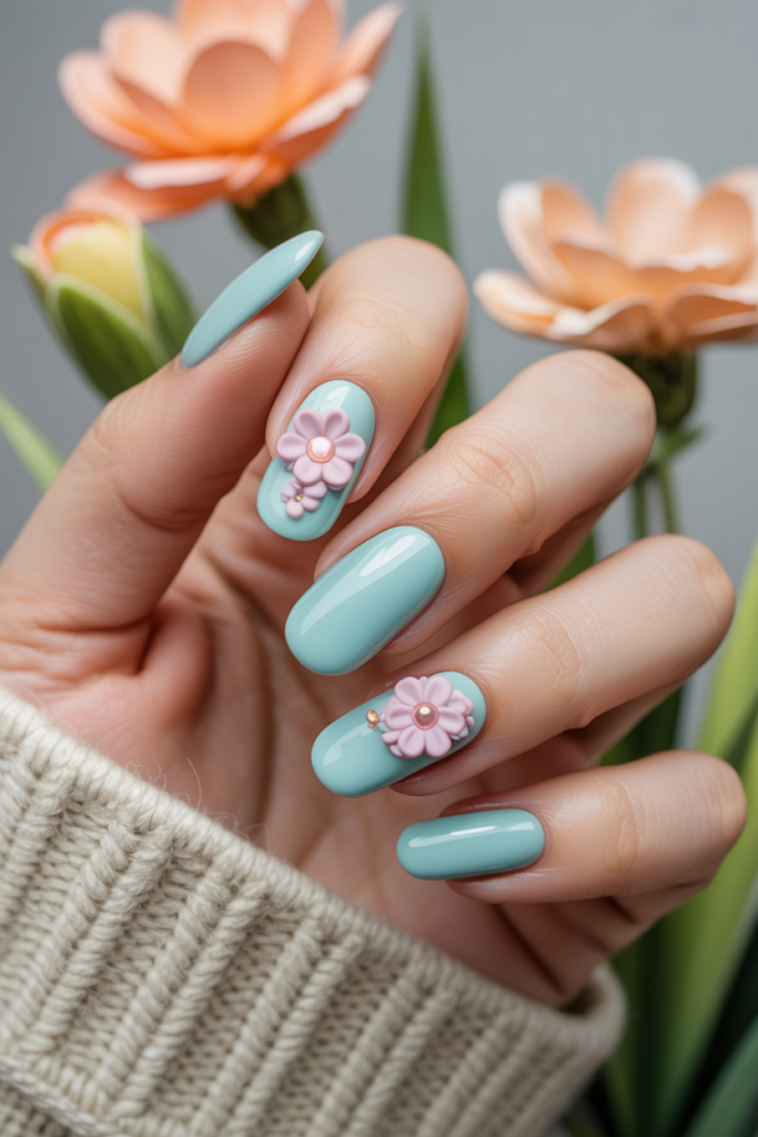 Light aqua nails offer a fresh, calming base perfect for spring. Adding 3D flower embellishments creates texture and interest without overwhelming the design. This look combines simplicity with subtle detail, making it suitable for many styles and occasions.