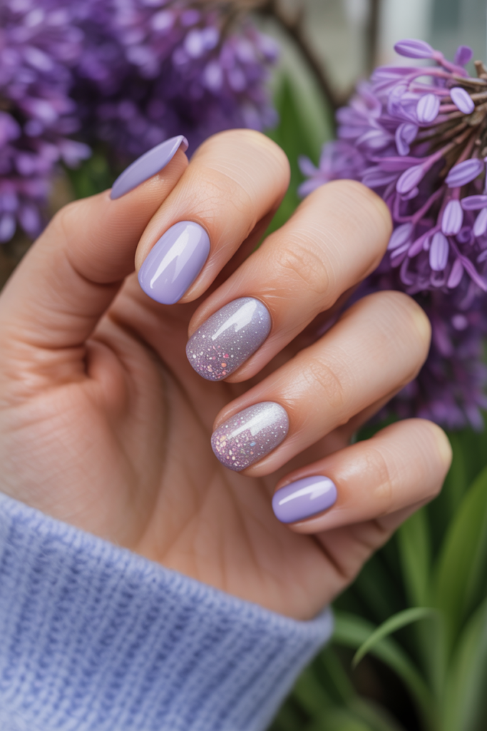 This style blends soft lilac with sparkling glitter for a smooth gradient effect. The glitter starts light at the base and intensifies toward the tips.
