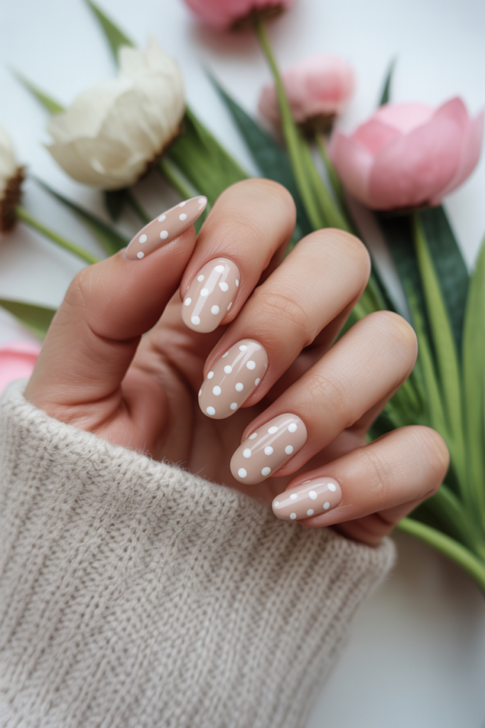 This design combines a soft nude base with small white polka dots. The almond shape adds elegance while keeping the look playful.