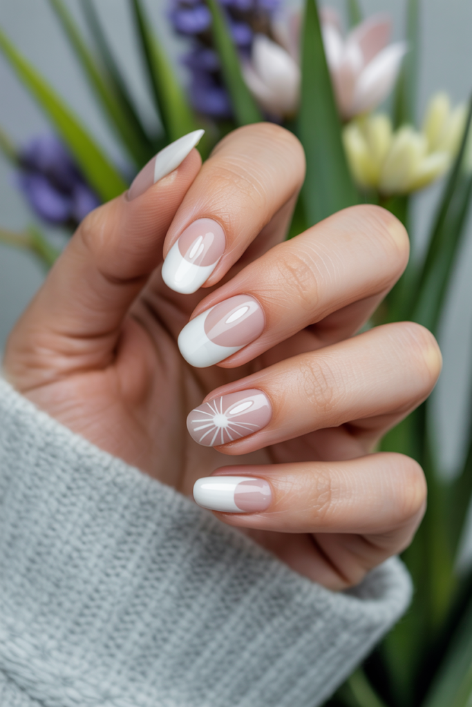 French tips with floral accents add a soft, fresh touch to classic nail designs. Small flowers on one or two nails create subtle decoration without overwhelming the look. This style works well with pastel or neutral shades, perfect for spring gel nails.