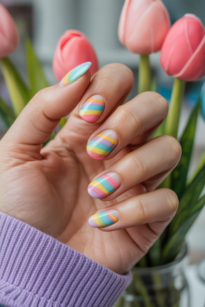 Pastel rainbow stripes create a soft, colorful look perfect for spring. The gentle colors blend well, adding a fresh and light feel to any gel manicure. This style works on all nail shapes and can be customized with different stripe widths or spacing.