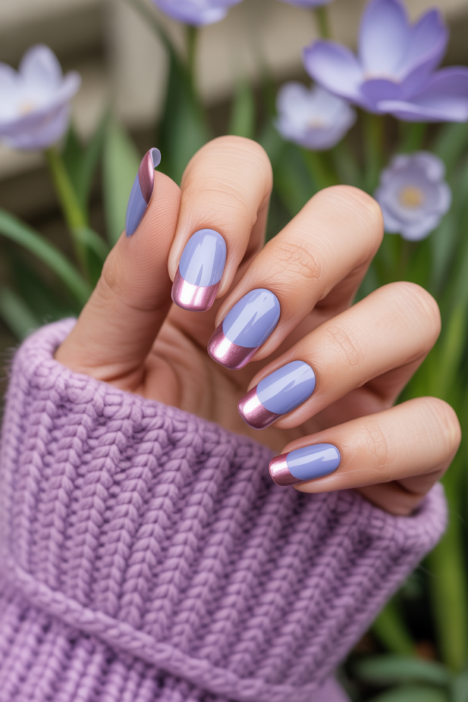 This design pairs soft periwinkle gel nails with sharp metallic tips. The clean metallic edge adds a modern twist to the gentle base color. It works well on both short and long nails, offering a chic and simple look for spring.