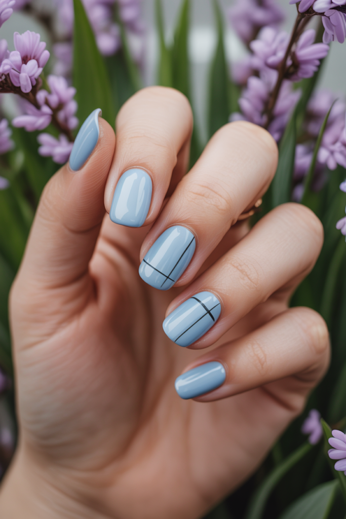 This look pairs soft powder blue gel with simple, thin lines. The lines often run diagonally or vertically, adding subtle detail without overwhelming the nails.