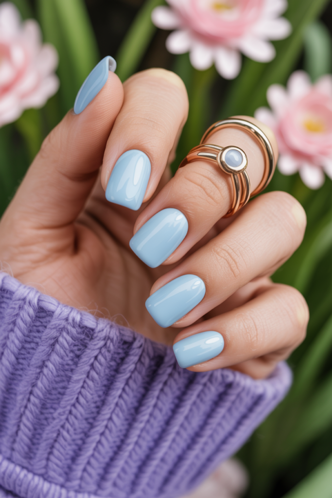 It suits those who want a clean, modern style. The minimalist design highlights the calm, cool tone of the powder blue polish.