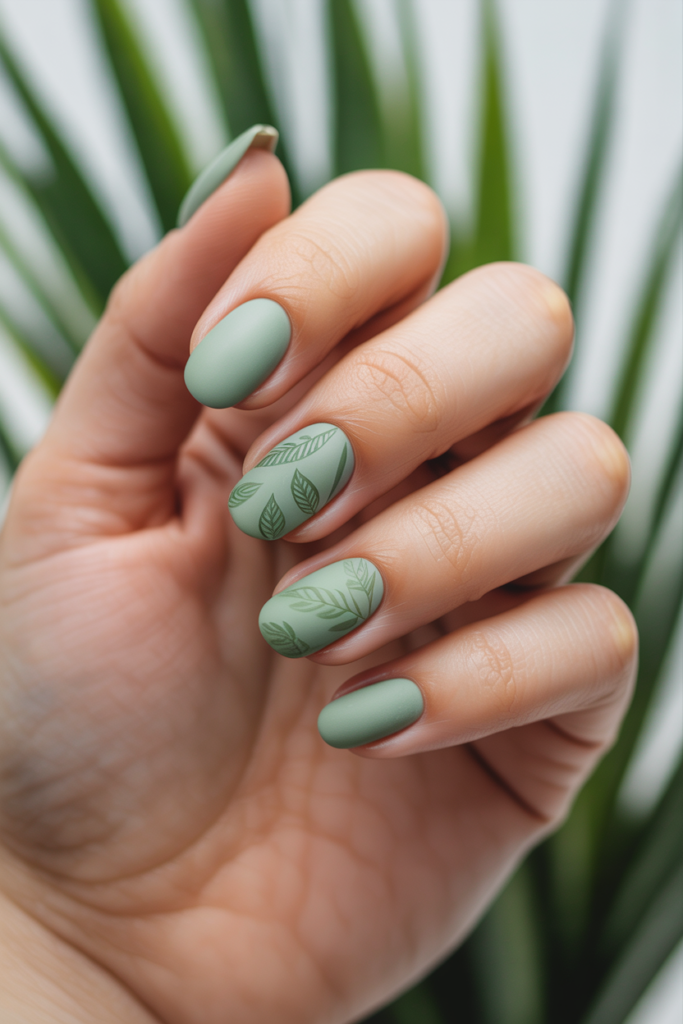 This design uses soft green matte polish for a calm, natural look. Leaf patterns are added to give subtle texture and detail. It often combines shades like pastel green, sage, and white for a fresh spring feel. The matte finish keeps the nails understated yet elegant.