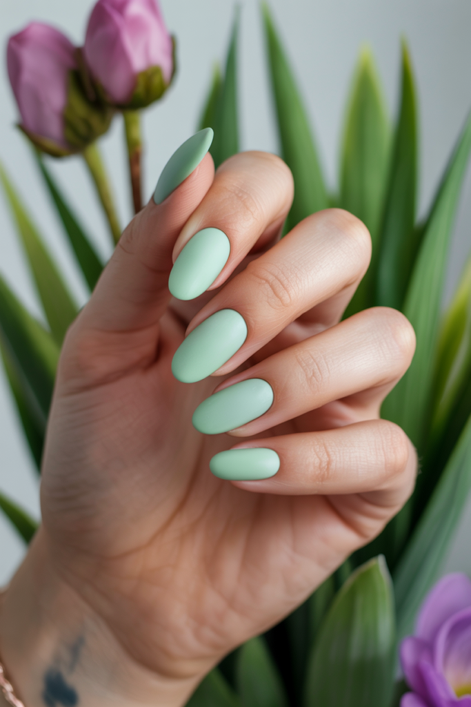 Solid mint green matte nails offer a clean, modern look. The soft color feels fresh and suits spring well. Matte finish adds subtle texture, making the polish less shiny but elegant. It works for any nail shape and skin tone.