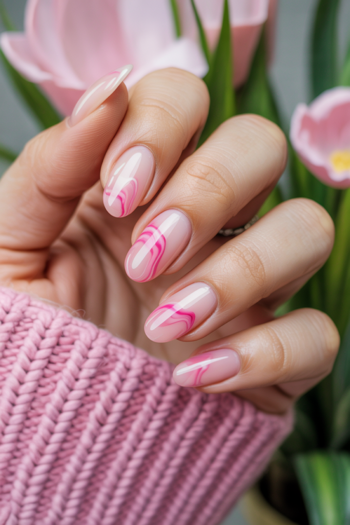 This design features a sheer pink base with soft, cloudy marble patterns. It looks natural and light, making it a good choice for spring. The effect suits short almond nails and works well for gel manicures. It balances elegance with everyday style.