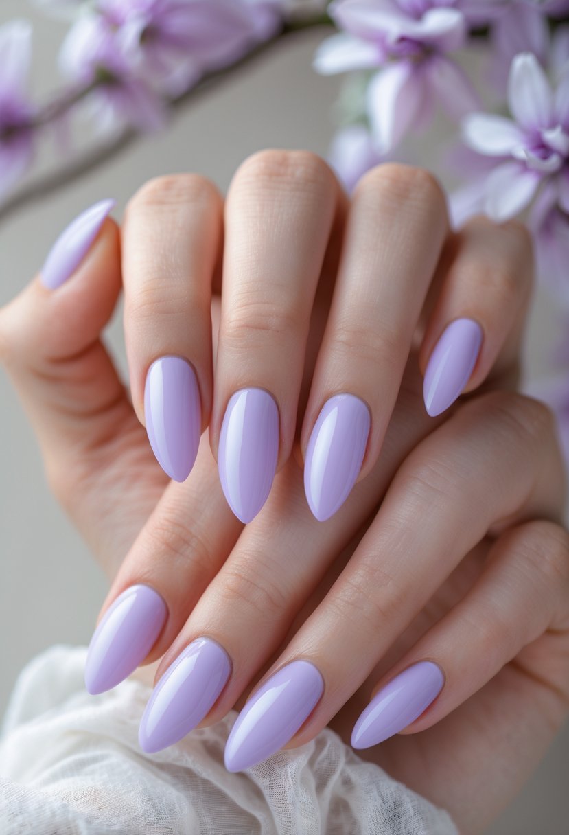 Almond-shaped nails in pastel lavender offer a soft, elegant look. The shape flatters most fingers, balancing length and style. Lavender adds a calm, fresh touch perfect for spring.