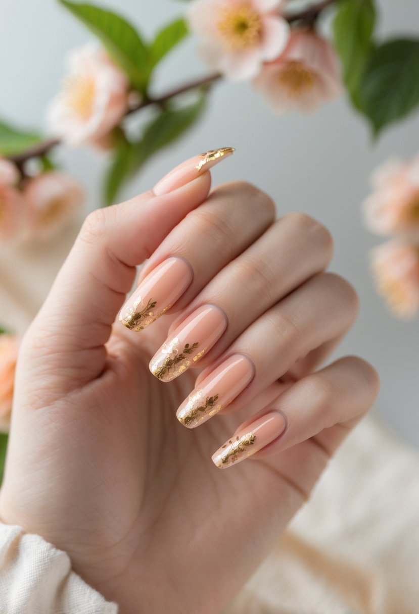Soft peach gel nails create a gentle and elegant look. Adding gold foil accents gives the design a subtle touch of luxury.