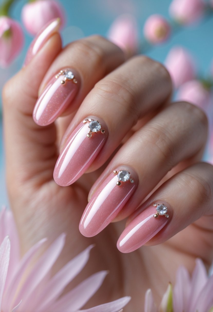 This look features a smooth, glossy rose color that gives nails a soft, elegant shine. Tiny rhinestones add a delicate sparkle without overpowering the design. It works well for both casual days and special occasions. The combination keeps the nails simple but stylish.