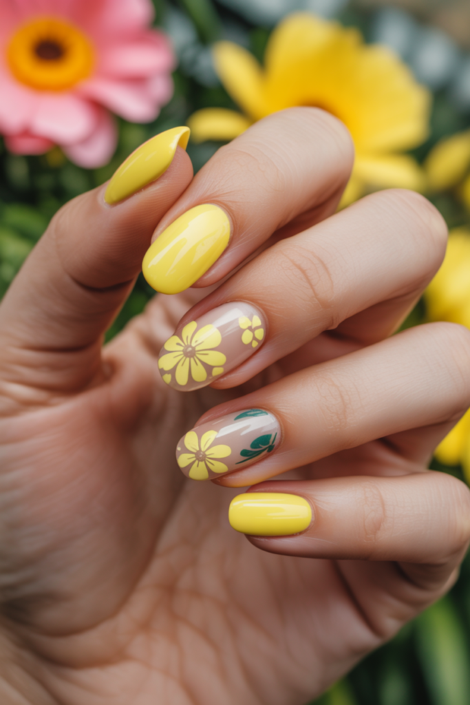 This style pairs bright yellow polish with detailed floral stickers for a fresh look. The contrast between the bold yellow and delicate flowers adds interest without being over the top. It suits medium to long almond-shaped nails well.