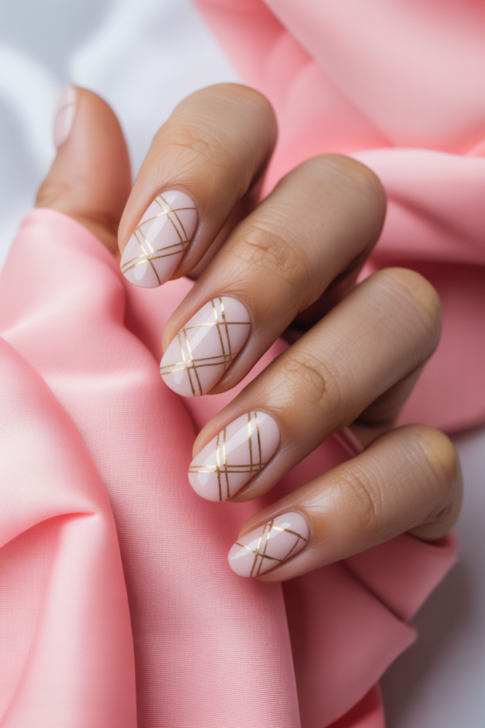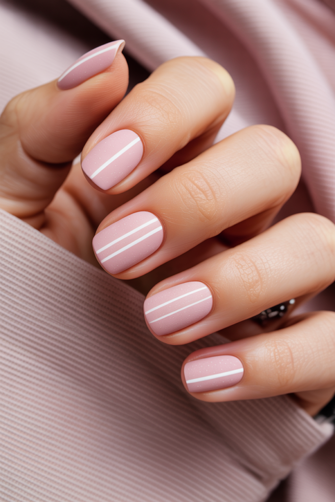 This look features a soft dusty pink base with a frosted finish. Thin, simple lines add a clean, modern touch without overwhelming the nails.