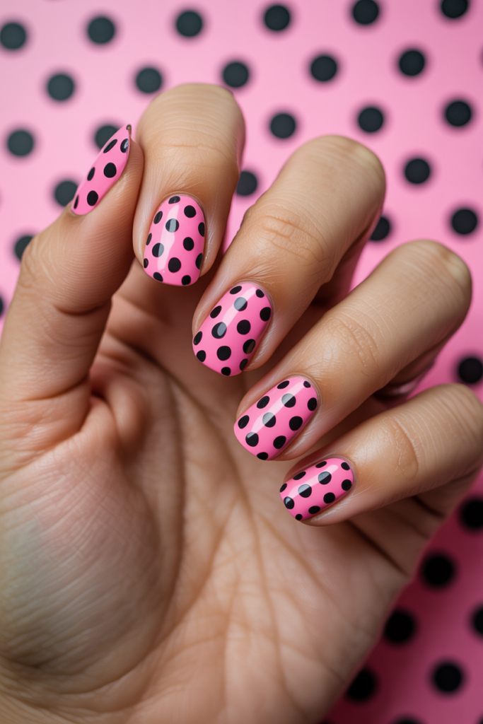 This design pairs bright bubblegum pink with classic black polka dots. It creates a fun yet stylish look.