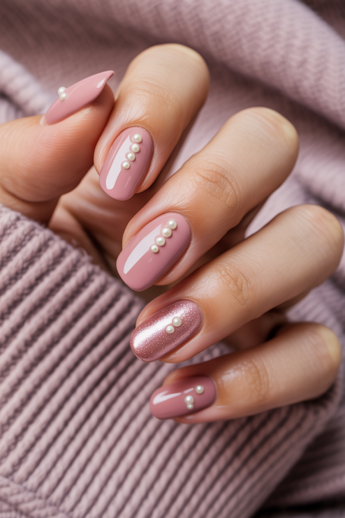 This look pairs a soft dusty rose base with small pearl accents. The pearls add a delicate, elegant touch without overpowering the subtle pink.