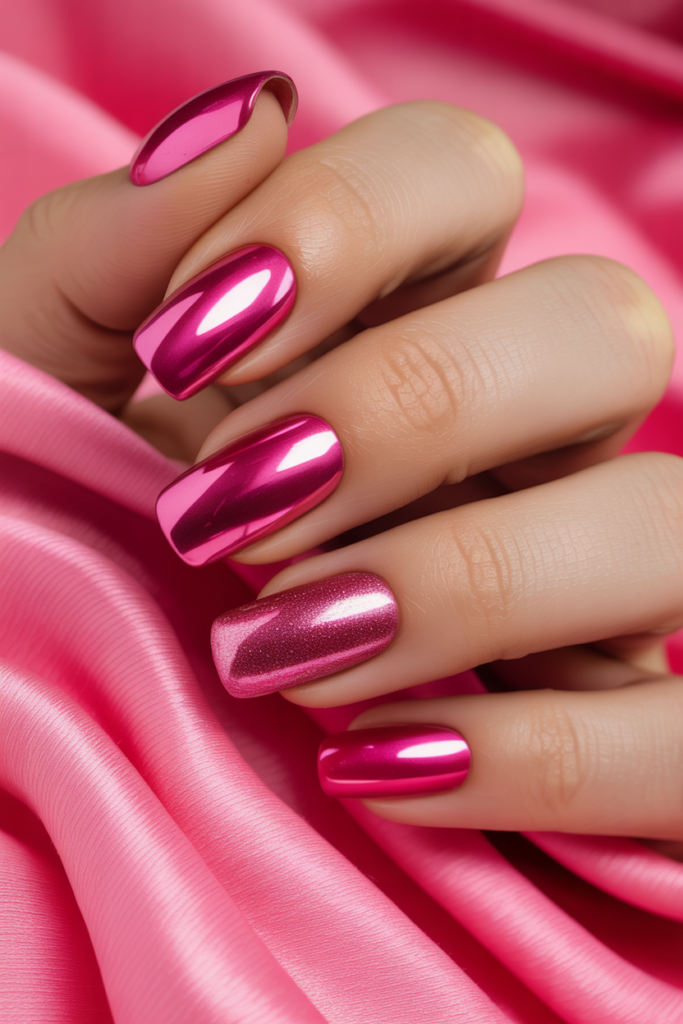 The glossy hot pink chrome finish is bold and modern. It gives nails a shiny, mirror-like look that stands out.
