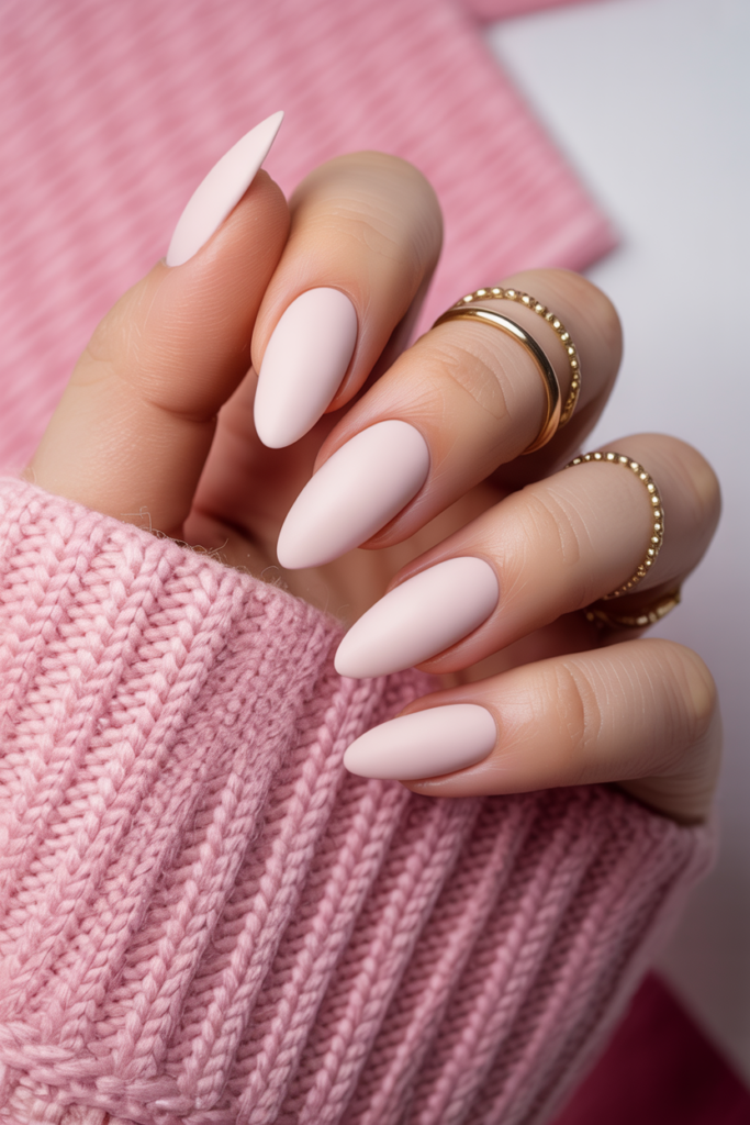 This nail style combines soft light pink with a matte finish for a fresh look. The almond shape adds elegance and extends the fingers’ appearance. It suits both casual and formal occasions without being too flashy. Matte texture keeps it modern and subtle.