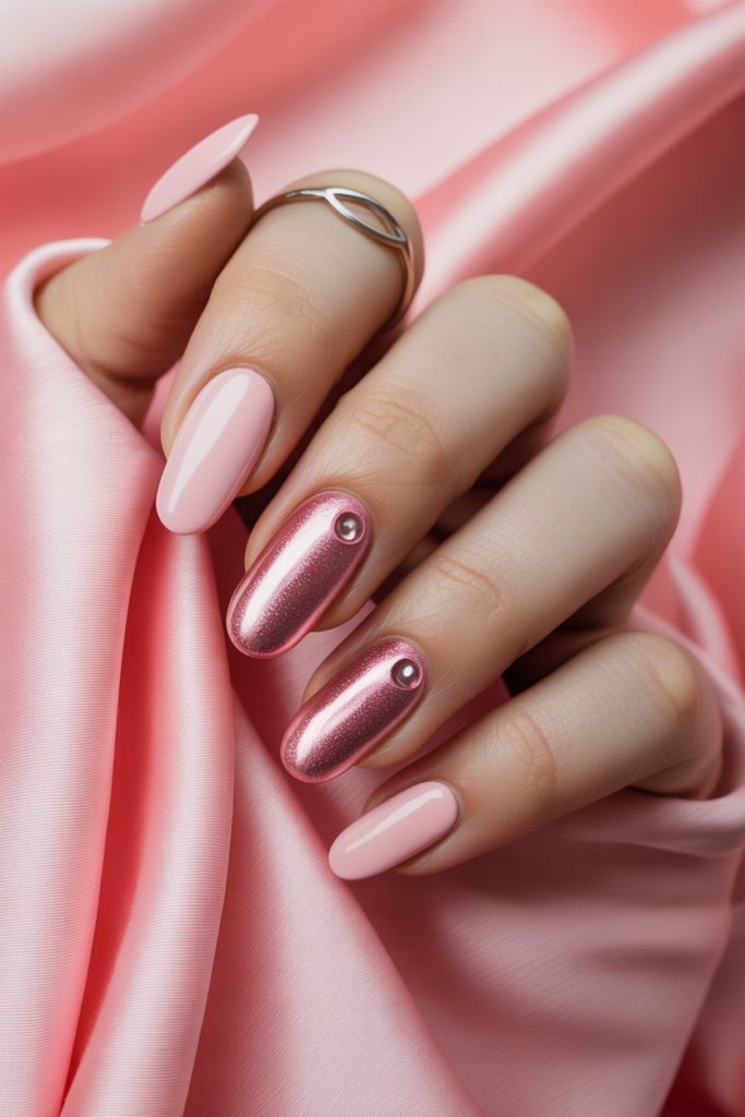This look pairs a soft pink base with metallic rose pink accents for a subtle yet striking effect. The metallic shine adds a modern touch while keeping the overall style gentle and elegant.