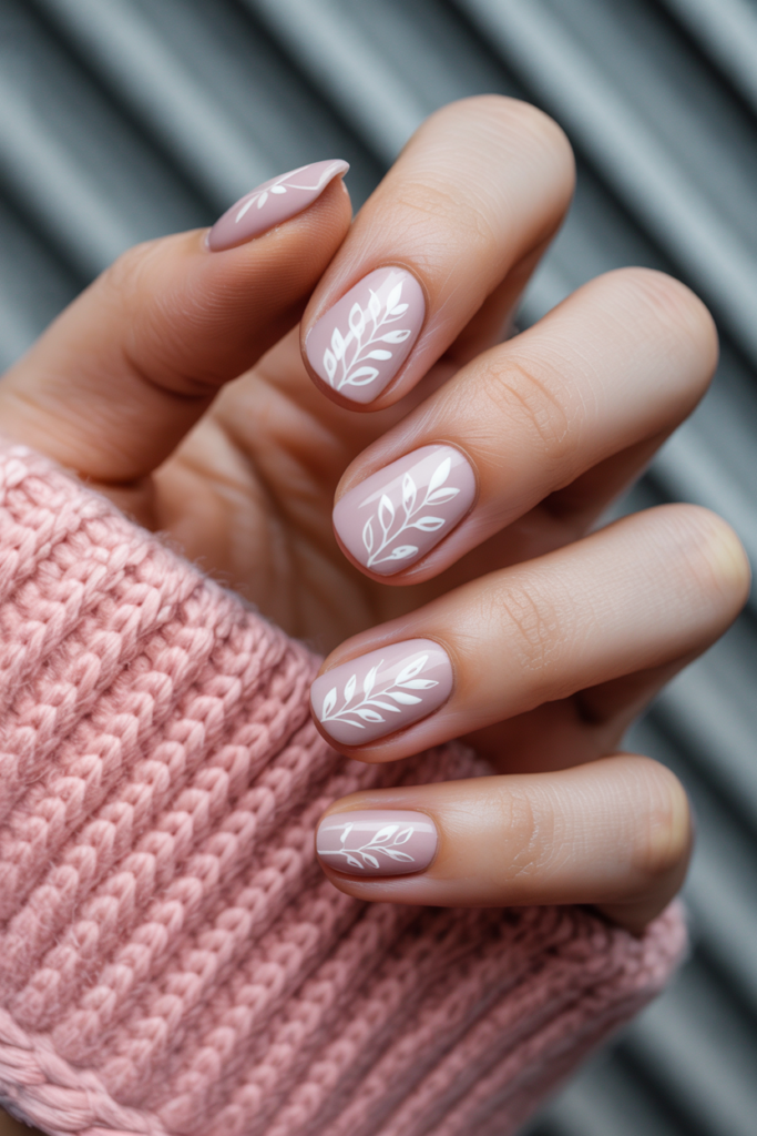 This design pairs a soft pale pink base with small, detailed white leaf patterns. It creates a subtle, elegant look suitable for spring.