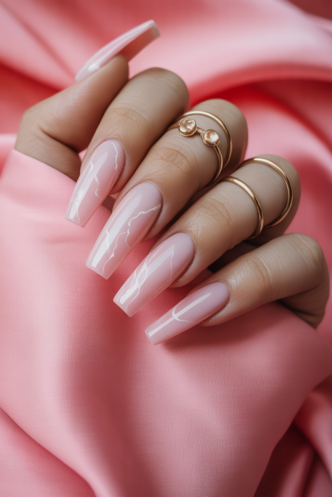 This style pairs soft pastel pink with delicate white marble veins. The look is polished with a glossy top coat for subtle shine.