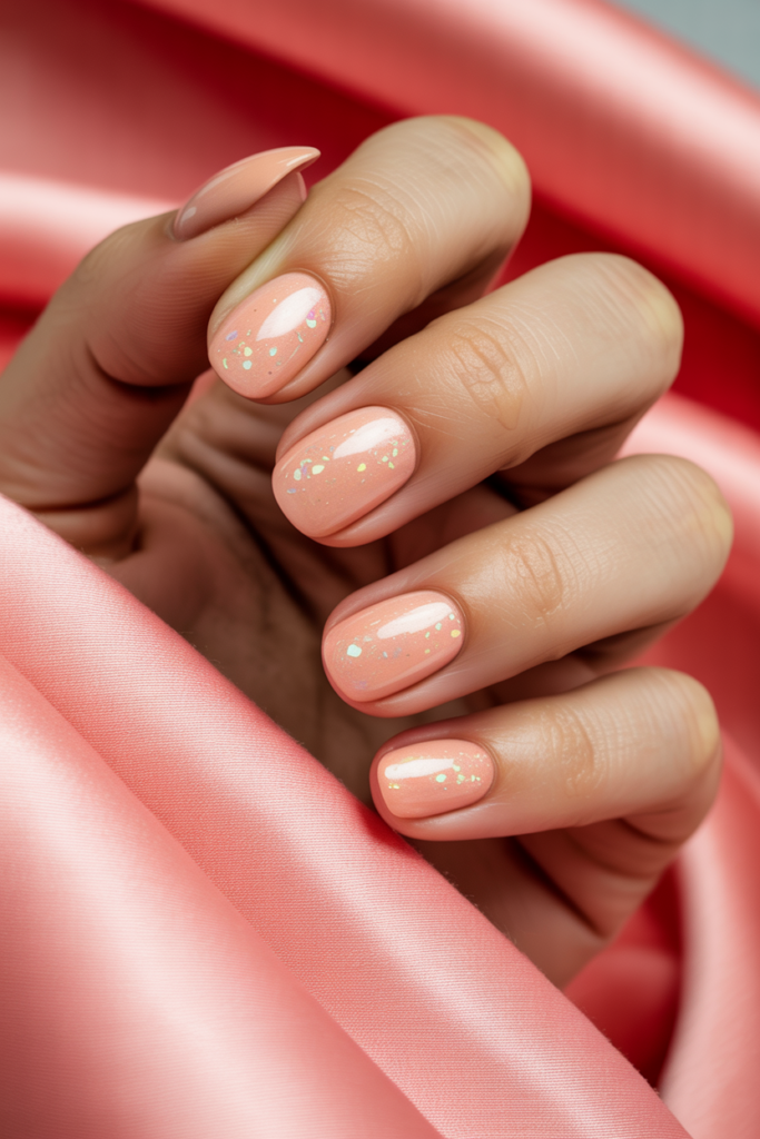 This look combines soft peachy pink polish with delicate shimmer flakes. The shimmer adds a gentle sparkle without overwhelming the color. It works well for a natural, polished style that still feels fresh for spring.