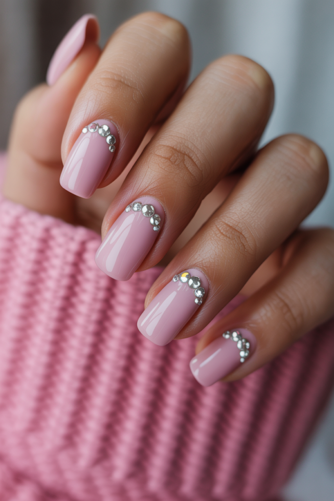 This style pairs soft pink nail polish with small rhinestone groups. The rhinestones add subtle sparkle without overwhelming the look. It works well for both casual and formal settings.