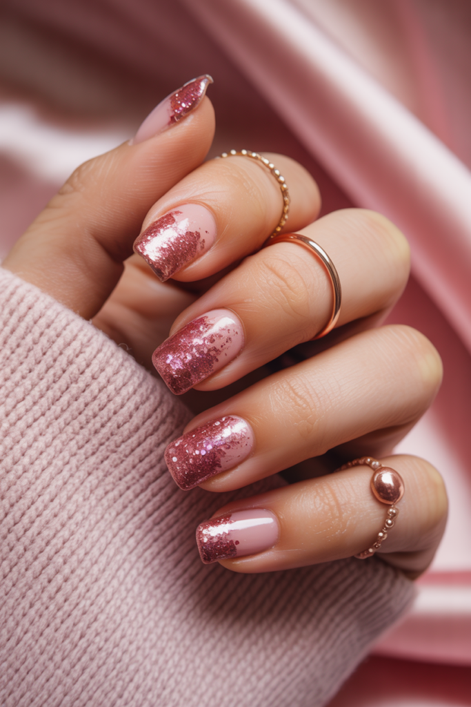 This design blends soft rose gold shimmer with pink tones for a warm, elegant look. Glitter tips add a subtle sparkle without overpowering the nails.