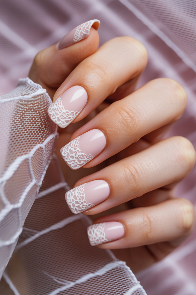 This design uses a soft pink base color for a gentle look. White lace patterns are added on top for a delicate and detailed effect. The lace gives the nails a vintage and elegant style without being too bold.
