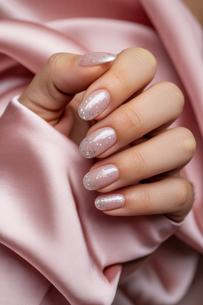 This nail design features a soft, sheer pink base that looks natural and clean. Tiny silver sparkles are added for a gentle shimmer without being too bold. It creates a delicate, elegant look suitable for many occasions.