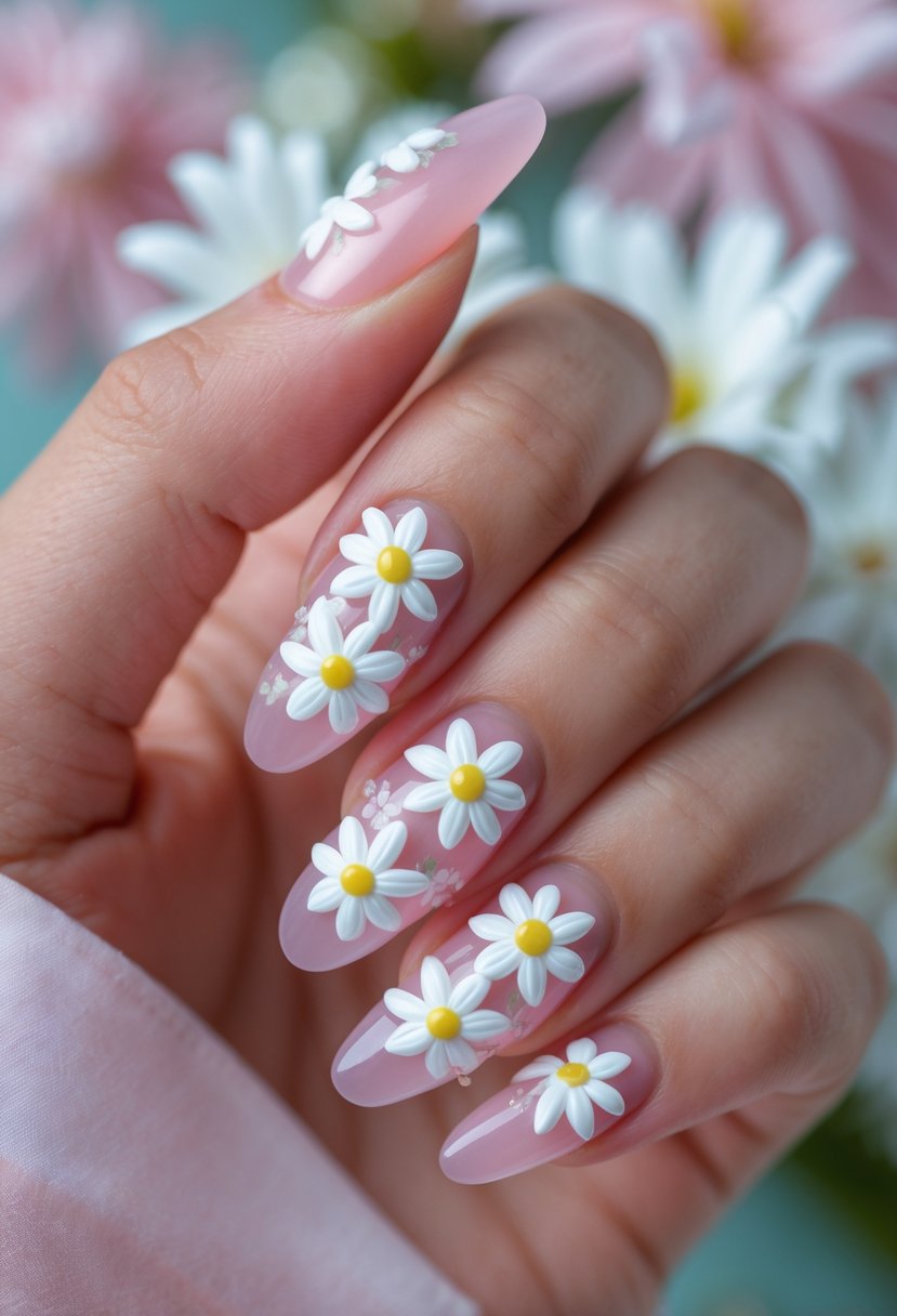 This design uses a soft, translucent pink base to create a light and airy look. 3D daisies are added on top for texture and a subtle spring feel. The daisies often have white petals with small yellow centers, keeping the design simple and fresh.