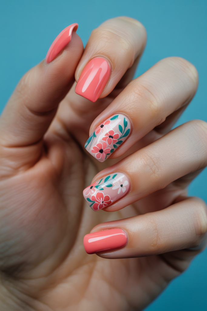 This design features a bright coral pink base that stands out. Hand-painted flowers add a delicate and detailed touch. The floral art creates a natural, fresh look perfect for spring. It works well on different nail shapes and lengths.