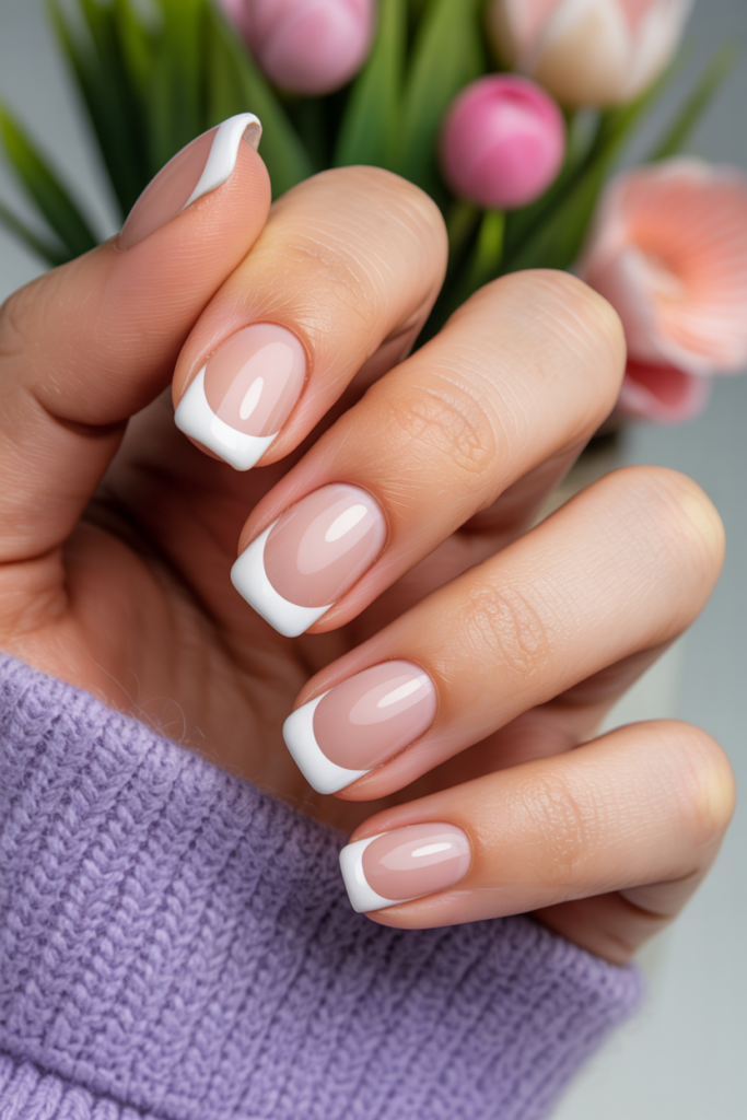 The classic French tip suits short square nails well. It adds a clean, polished look that is both simple and stylish. The white tip contrasts nicely with a natural or soft pink base. This design can be worn for any occasion and looks neat and elegant.