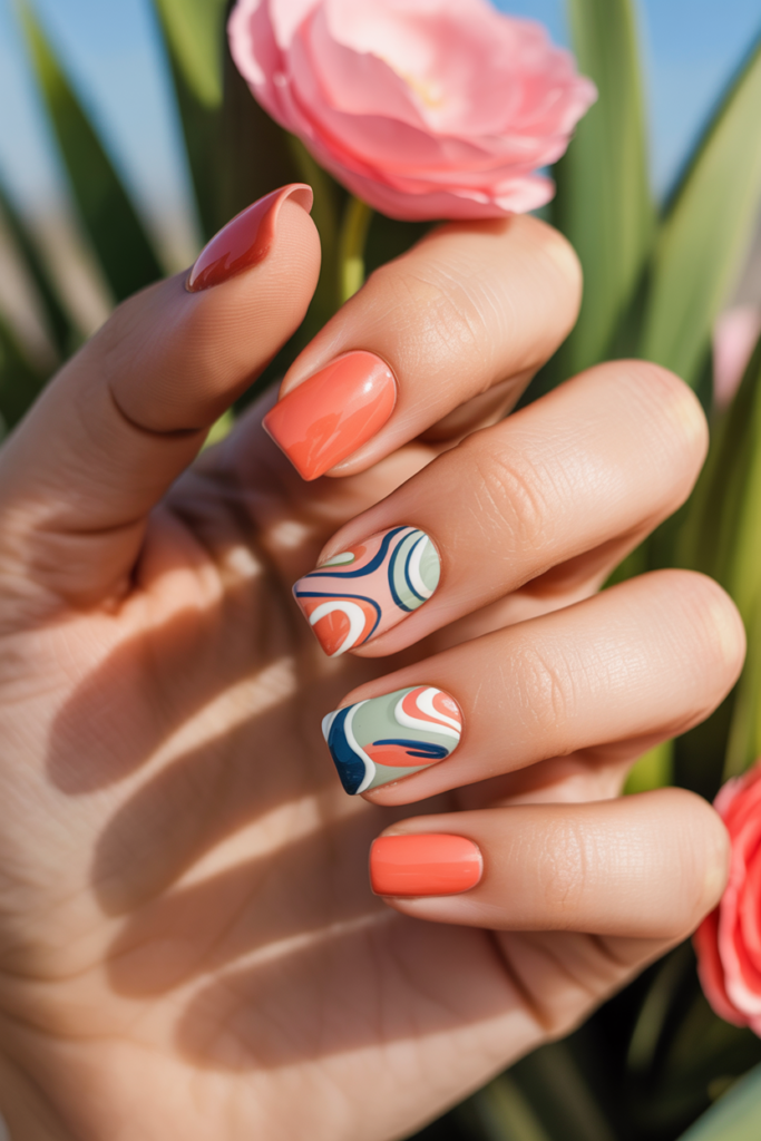 Coral square nails with abstract designs offer a fresh, modern look. The bright coral base pairs well with irregular shapes and lines in neutral or contrasting colors. This style works on both short and long nails, making it versatile for spring.
