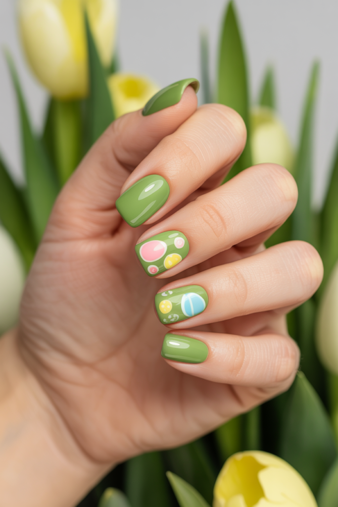 These nails feature soft green shades with speckled patterns, mimicking the look of Easter eggs. The design balances simplicity with festive detail. It suits those who want a fresh, subtle nod to spring without bold colors.